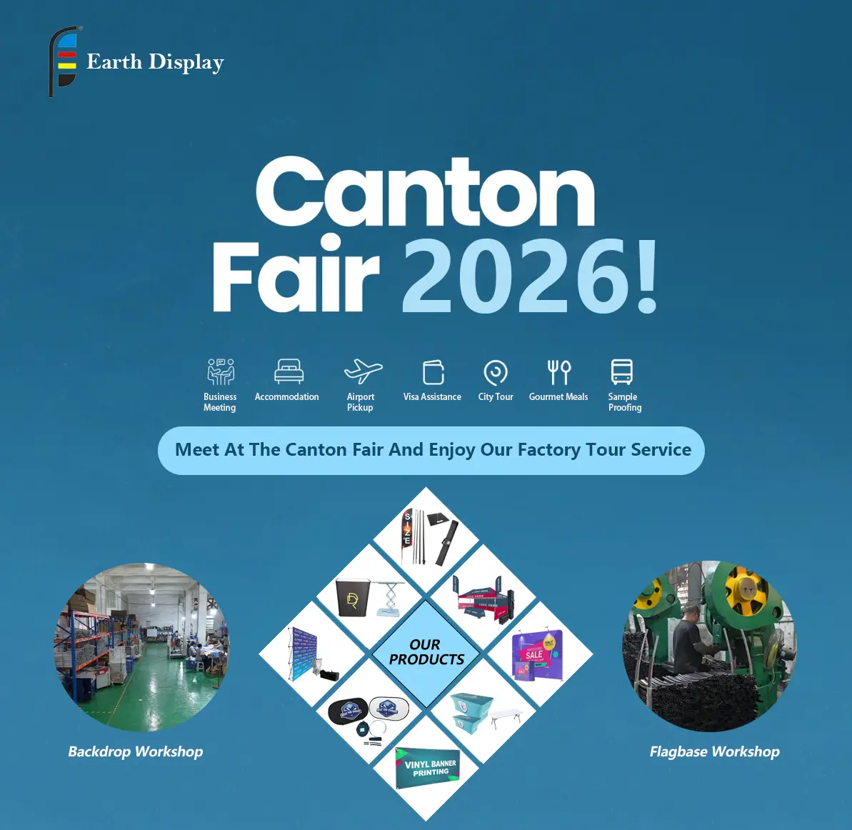 2026 कँटन फेअर येत आहे, आणि आम्ही पृथ्वी डिस्प्लेवर खरोखर तुम्हाला तिथे भेटण्याची आशा करतो. आम्ही पंखांचे ध्वज, पॉप-अप बॅकड्रॉप्स, ध्वज बेस, सानुकूल विनाइल बॅनर - मुळात प्रदर्शन आणि जाहिरातींसाठी काहीही - आता दहा वर्षांहून अधिक काळ बनवत आहोत. यावेळी, फक्त ऑनलाइन बोलण्याऐवजी, आम्ही तुम्हाला समोरासमोर काय करतो ते दाखवायचे आहे.